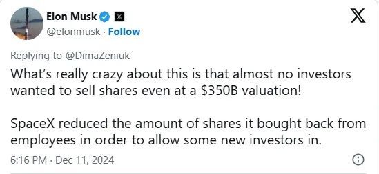 周三今日,SpaceX过甚投资者应许从职工和其他公司里面东谈主士手中购买总值12.5亿好意思元股票。该来去对SpaceX估值约为3500亿好意思元,使SpaceX成为群众最有价值的私营初创企业。马斯克在外交媒体上暗意,在3500亿好意思元的新估值下,险些莫得投资者知足出售股票。