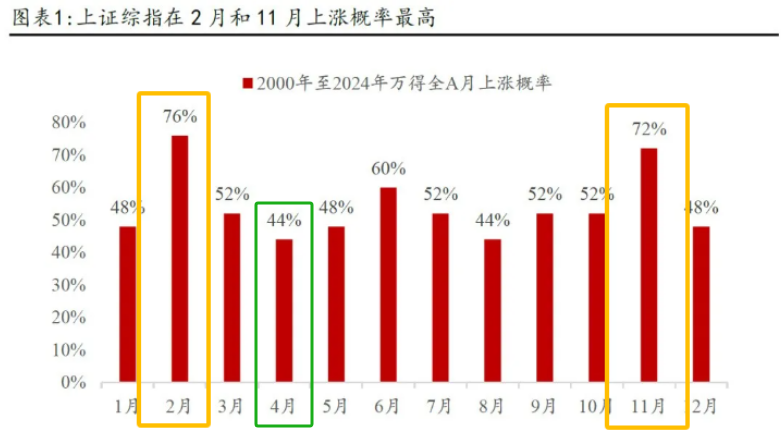 4月是年报和一季报窗口,资金会提前避险,机构也需要凭证财报进行调仓。2月是一年当中胜率最高的,而4月是胜率最低的。